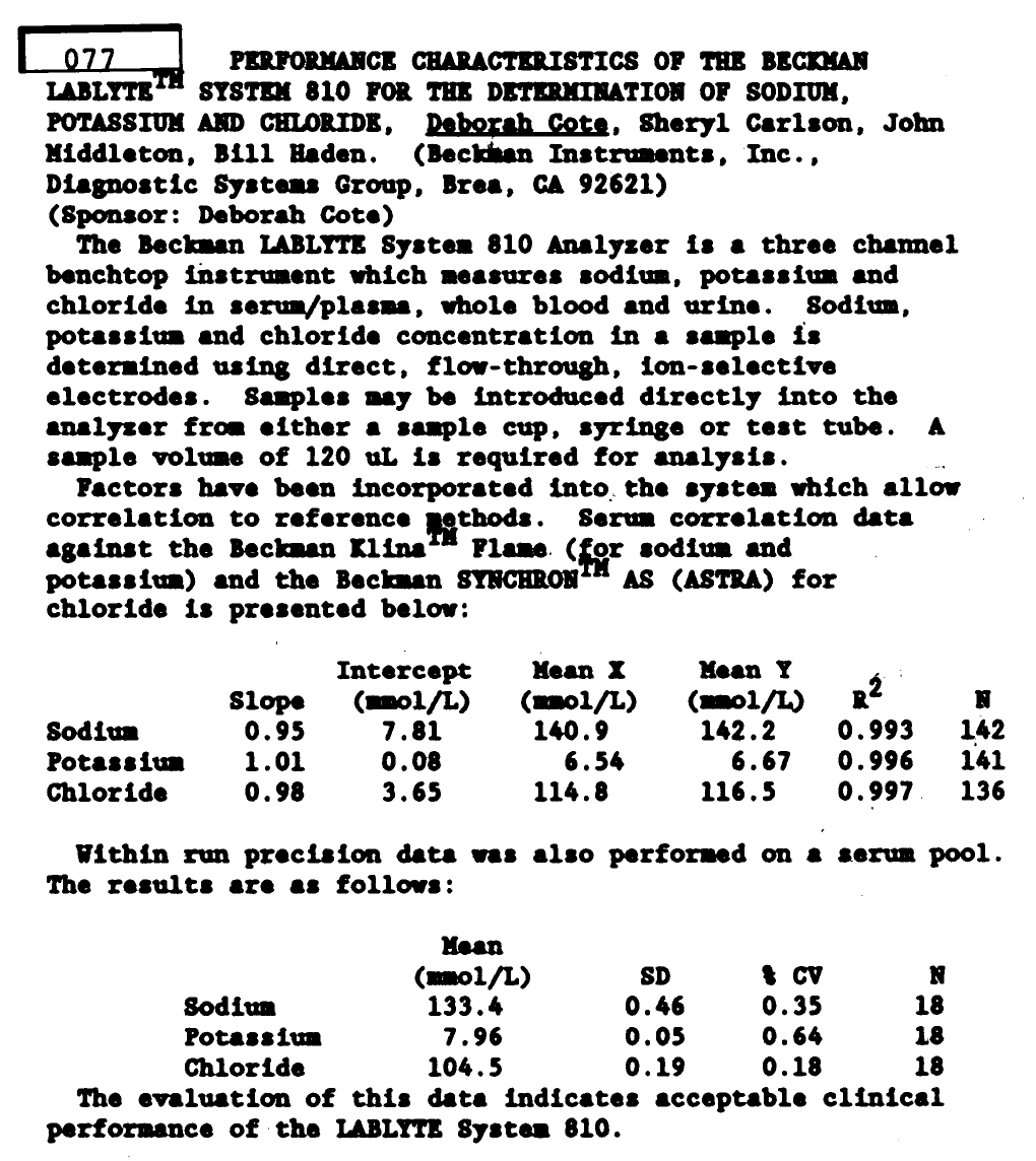 My first responsibilities were to run line support experiments for the Astra instrument. Here a pre-defined set samples were tested for a pre-defined set of assays. I was not designing experiments at this juncture. Since there was considerable down time between experiments, I took advantage of the opportunity to familiarize myself with this strange and wonderful thing known as a personal computer. I started learning Lotus 1-2-3 using the communal IBM machines (XT and AT models) and got some of my first tastes of data analysis. Based on my performance at this position I earned a promotion and was hired as a Senior Technician permanent employee. I later got involved in Synchron CX3 and Lablyte development. At the 1988 AACC conference poster session my name first entered the light when it appeared in the authors list for an abstract on Lablyte analytical performance. Of course, I was included because I made a number of the measurements that were presented.