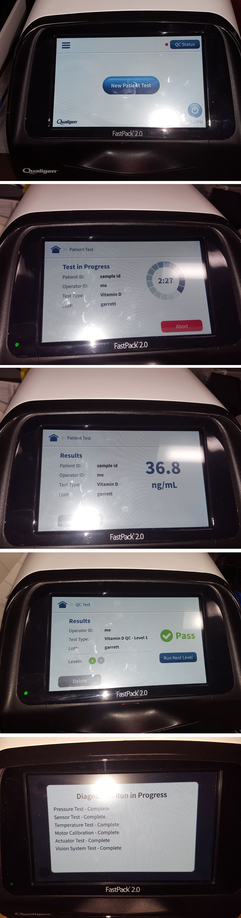 Since public demonstrations of the instrument have been performed at the national AACC meeting, I have no problem sharing some poor cell phone pictures through this LINK. Shown are the instrument in standby, a test in process screen, patient result screen, calibration/QC result screen, and instrument self-test screen.